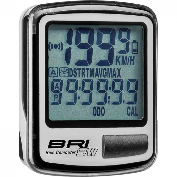 Велокомпьютер BRI-9W беспроводной серый, 9 функций: текущая скорость, текущая пройденная дистанция, общая пройденная дистанция, 12/24 часы, средняя скорость, максимальная скорость, время езды, сканирование данных, подсчёт затраченных калорий за поездку.